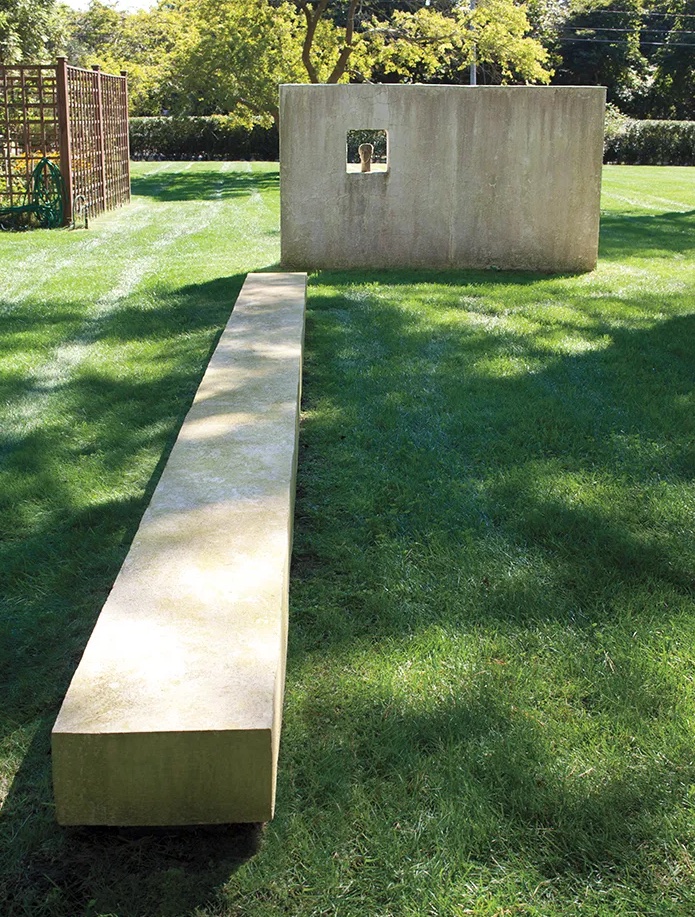 Dall’esterno, la casa appare come un semplice casale, di dimensioni contenute, rivestito con tegole di legno, tipiche del paesaggio degli Hamptons. Ma varcando la soglia, si entra in un universo intimo e luminoso, dove le pareti bianche raccontano una storia di espressione artistica che attraversa le generazioni. Le sculture grezze e scolpite a mano da Costantino Nivola abitano ogni angolo: la casa principale, il fienile adiacente, lo studio, e persino il giardino, dove lunghe pareti in cemento colato nella sabbia – incise direttamente quando il materiale era ancora fresco – decorano lo spazio.