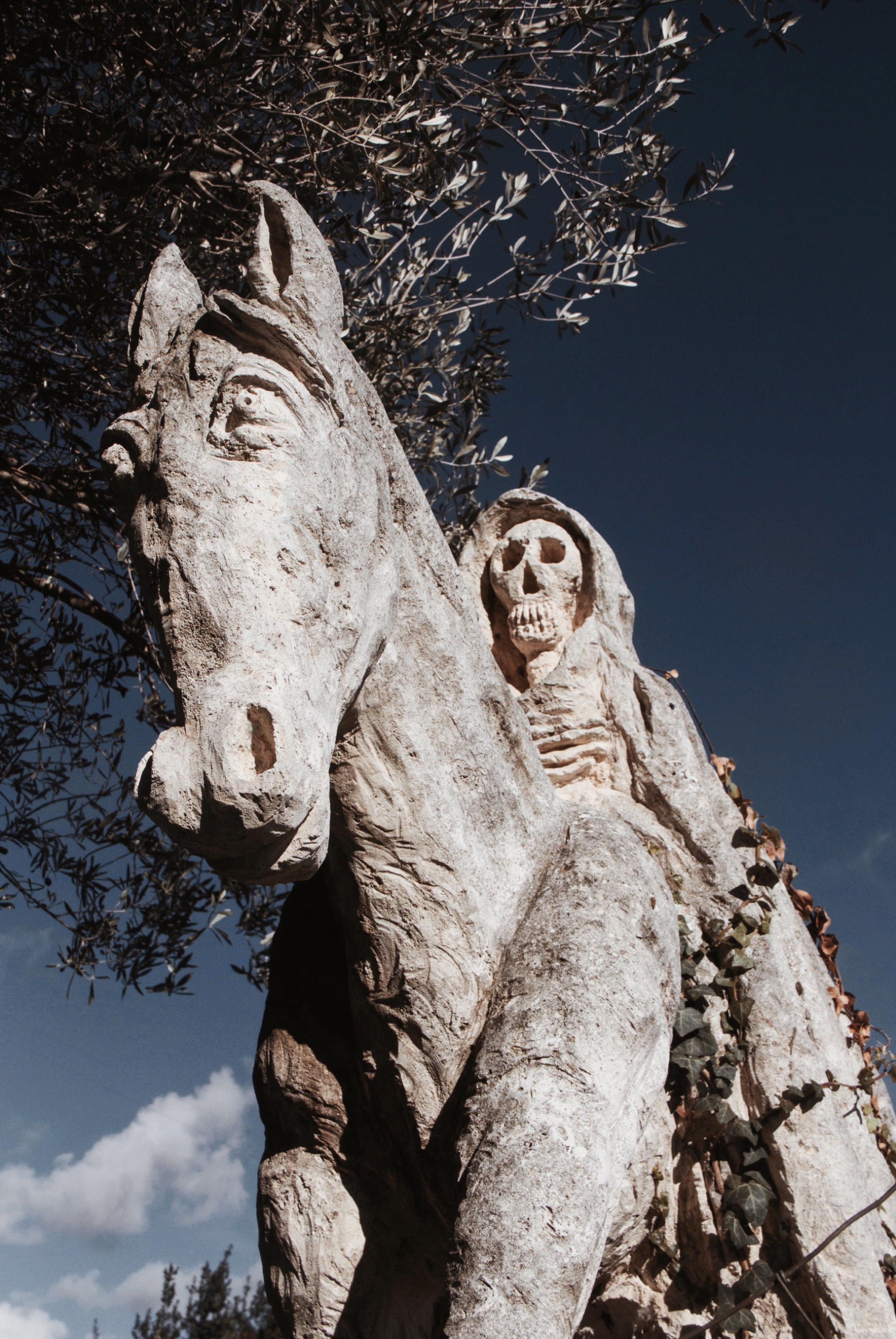 He repeatedly appears as if in a strange dream, in an attempt to send surreal stone messages to the viewer. Among all the sculptures, a dark and deeply enigmatic image of Death on Horseback stands out, which over the decades has made it appear even more romantic due to the enveloping and infesting presence of English ivy (Hedera Helix).